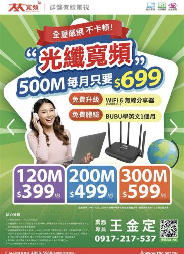 大大寬頻 大大優惠 ▼ 飆速300M+WiFi6+有線電視A組 $300/月(年繳) 限定區域